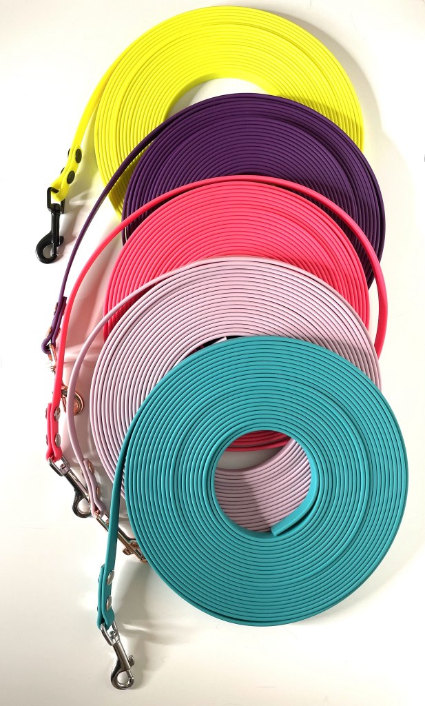 Collars, Leashes and Long Lines made from genuine Biothane webbing for all your active dog needs!