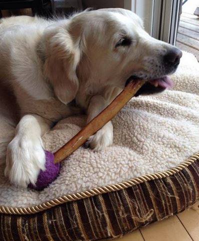 A) ANTLERS – Natural, unbleached antlers make great chews for light to moderate chewers. These are best sourced from farms or hunter friends to avoid bleaching, which is a standard process that pet-store antlers undergo, and can make the antler brittle. A nice big brown (fresh) antler is naturally appealing to most dogs but you can also soak an end in chicken broth for ten minutes to encourage a reluctant chewer. Be sure to choose an antler that is quite large compared to your dog, so that they cannot swallow it or crunch it with their molars. Note: Antlers that have been processed (bleached and/or cut into small pieces) can be a hazard for vigorous chewers. It’s always best to supervise to ensure your dog is chewing appropriately.